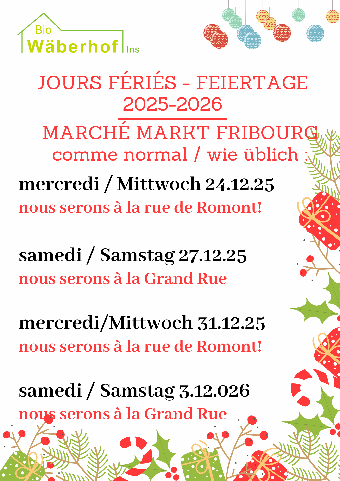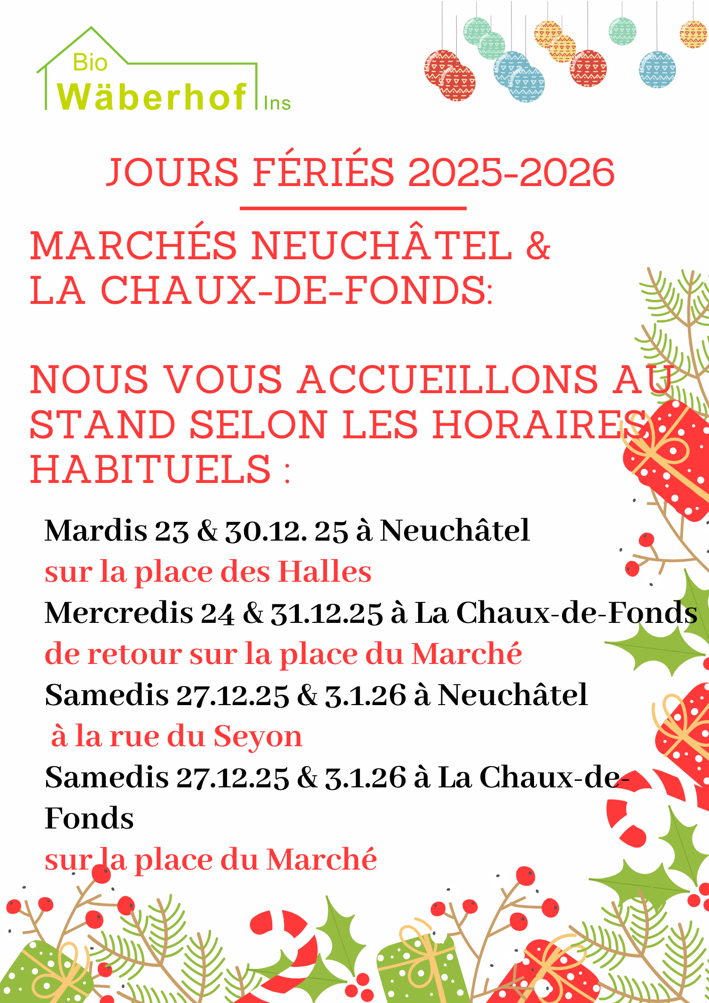 Horaires d'ouverture de fin d'années au magasin à la ferme et sur les marchés